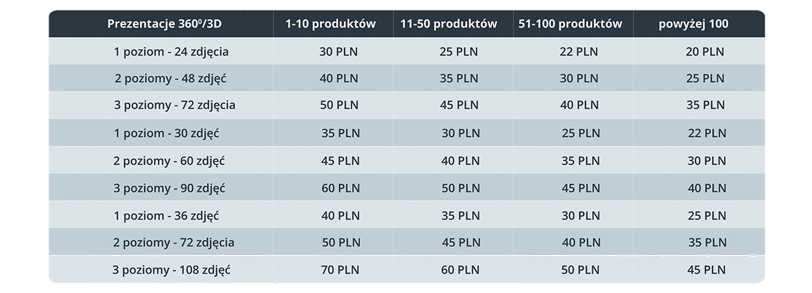 * Ceny netto podane są dla różnych sekwencji prezentacji produktów o wymiarach 30 x 30 x 30 cm i maksymalnej wadze do 40 kg. Wyjściowa rozdzielczość dłuższego boku to 800 pikseli z maksymalnym powiększeniem do 2400 pikseli. Format pojedynczego zdjęcia osadzonego w prezentacji to jpeg, natomiast prezentacja 360/3D zapisana jest w html 5. Tło prezentacji białe. Z każdej prezentacji istnieje możliwość wyeksportowania poszczególnych zdjęć w formacie jpeg i użycia jako packshot produktu. Czas realizacji (dla 50 jednolitych produktów) - 2 dni robocze. W przypadku zleceń ekspresowych doliczane jest 50% wartości netto PLN całego zlecenia.